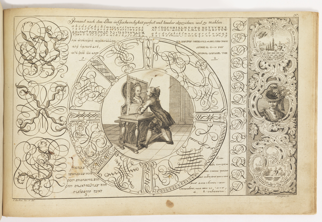 This plate, depicting a portrait artist at work surrounded by an array of curvilinear designs, alphabets, and emblems, is from a remarkable example of 18th-century ornamental typography. The book's 56 plates, illustrated by Merken and engraved by Coentgen, consist of elaborately drawn alphabets and instructions for making ink, making silhouettes, constructing sundials, basic penmanship, drafting, insect collection, and drawing. Its contents also include writing styles, portraits, monograms, calendars, fanciful geometric and architectural figures, emblems, and genealogical tables.