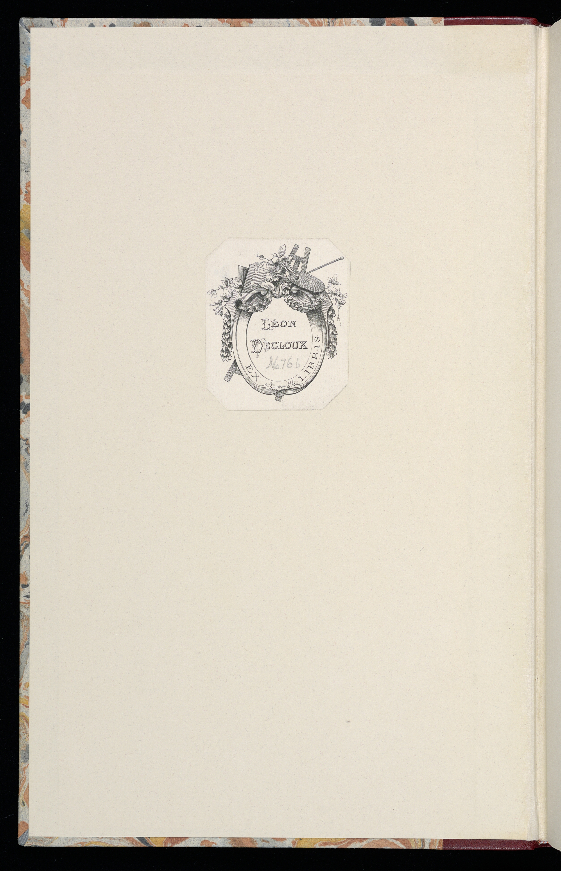 Léon Decloux Ex Libris, printed on paper, pasted to the middle of the paste down endpaper of the upper cover.