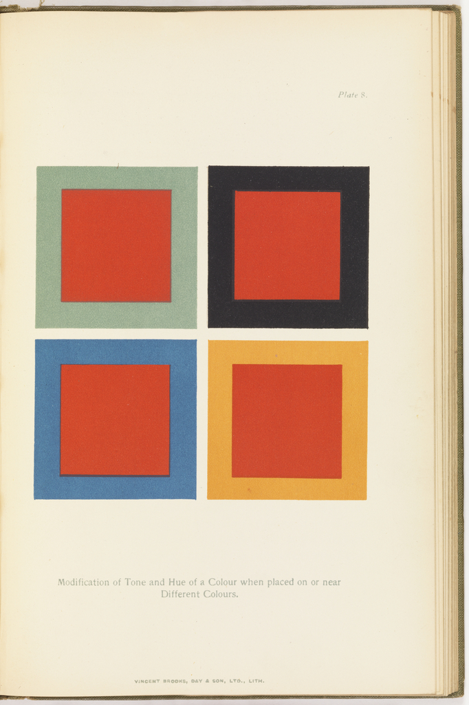 Book Illustration, Colour Harmony and Contrast: For the Use of Art Students, Designers, and Decorators...; Modification of Tone and Hue of a Colour when placed on or near Different Colours, pl. 8