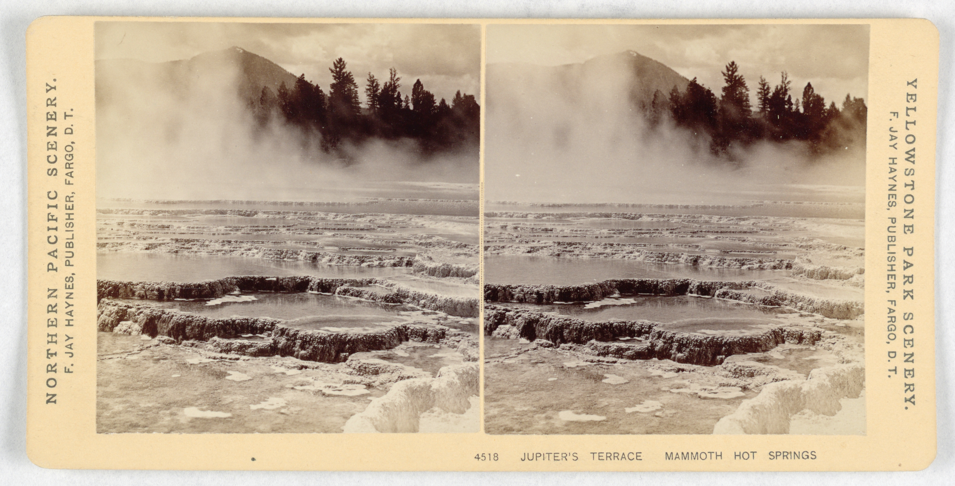 Box Of Stereoscopic Views, Thirty-Six Selected Haynes Stereoscopic Views of the Yellowstone National Park; Photographed by Frank Jay Haynes (American, 1853 – 1921); cream paperboard; Overall: 18.4 x 9.5 x 5.1 cm (7 1/4 x 3 3/4 x 2 in.) Each card: 8.9 x 17.7 cm (3 1/2 x 7 in.) Each photograph mounted side by side: 8 x 7.5 cm (3 3/16 x 3 in.); Gift of Dr. Richard P. Wunder; 1962-156-1-7