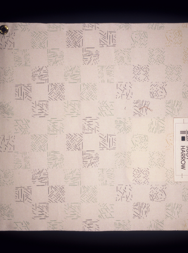 This is a Samples. It was designed by Jody Harrow and printed by Jody Harrow and made for PEKA PRINTS. It is dated 1983–85 and we acquired it in 1990. Its medium is various materials and its technique is hand screen printed. It is a part of the Textiles department.