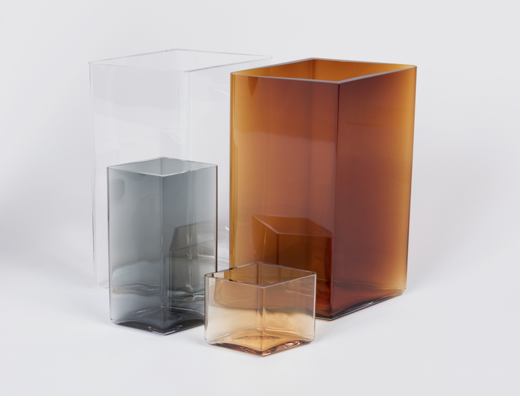 Ruutu (Finnish for diamond or square) is the name of this collection of modular vases produced in five sizes and seven colors. The Bouroullec brothers’ minimal, rectilinear vessels work together as a family of colored transparent glass forms that the user arranges to create a varied color landscape.