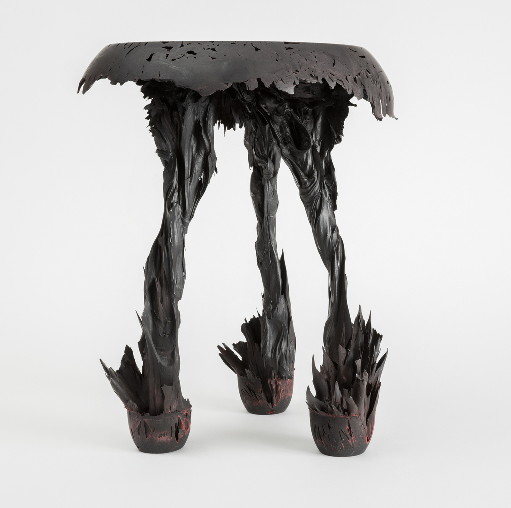 Van der Wiel explores the impact of natural forces on physical materials. Van der Wiel developed and built his own gravity machine, a tool that uses oppositional forces of gravity and magnetism to generate organic, armored forms made from a composite material of iron filings and plastic or ceramic. With the machine, van der Wiel creates tables, stools, and fantastical architectural that sprout stalactites.