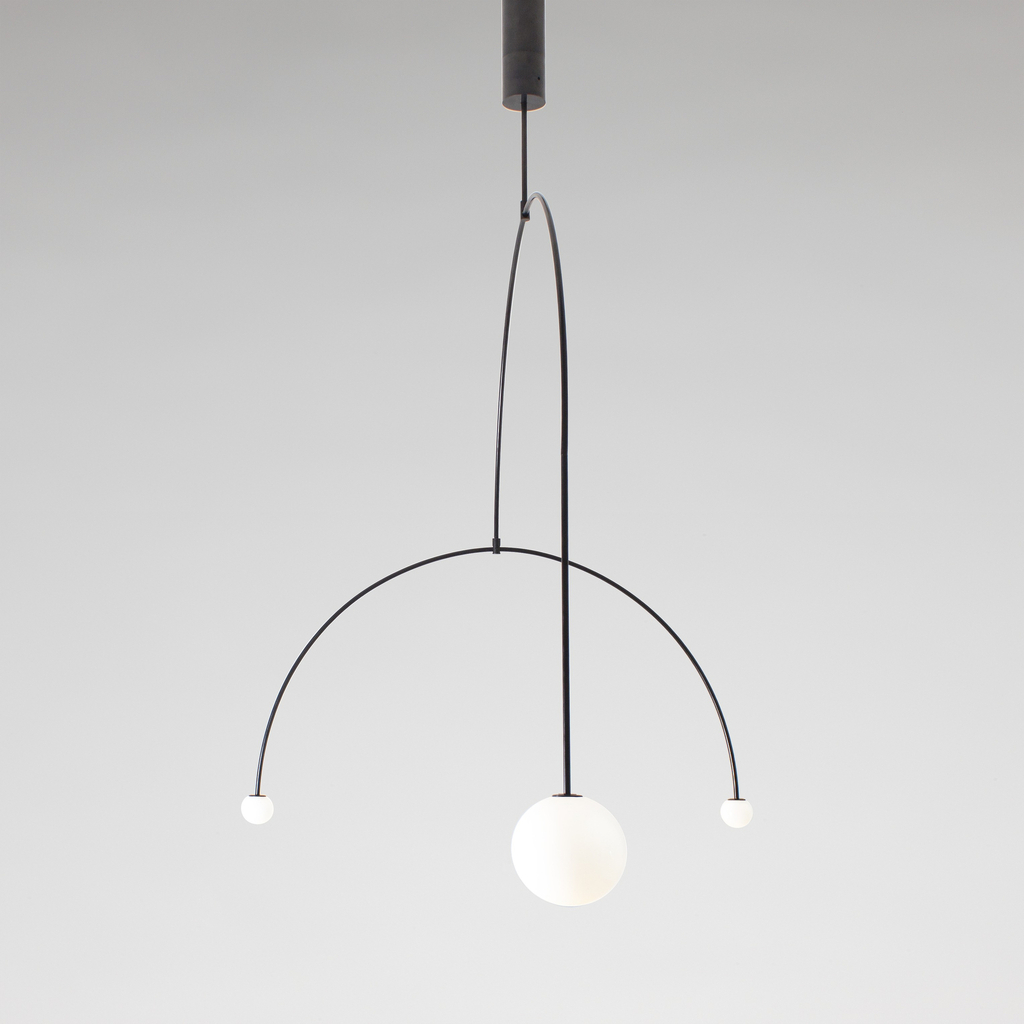 Mobile Chandelier 9 pairs symmetrical curves with opaline globes to create a lighting form that is elegant and graceful. The chandelier draws attention to the very nature of light as the patinated rods turn and the globes come forward or recede. Reducing concepts to their core is a recurring theme in Anastassiades’ work.