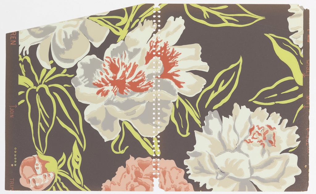This is a Sidewall - sample. It was designed by Ilonka Karasz and made by Katzenbach and Warren, Inc.. It is dated 1948 and we acquired it in 1949. Its medium is screen printed on paper. It is a part of the Wallcoverings department.