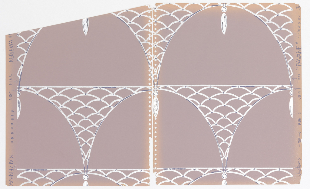 This is a Sidewall - sample. It was made by Katzenbach and Warren, Inc.. It is dated 1948 and we acquired it in 1949. Its medium is screen printed on paper. It is a part of the Wallcoverings department.