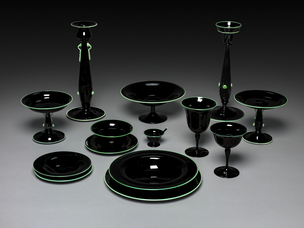 This is a Pair of Candelabra and a Single Place Setting. It was manufactured by Steuben Glass Works. It is dated ca. 1929–30. Its medium is black glass with green overlay.