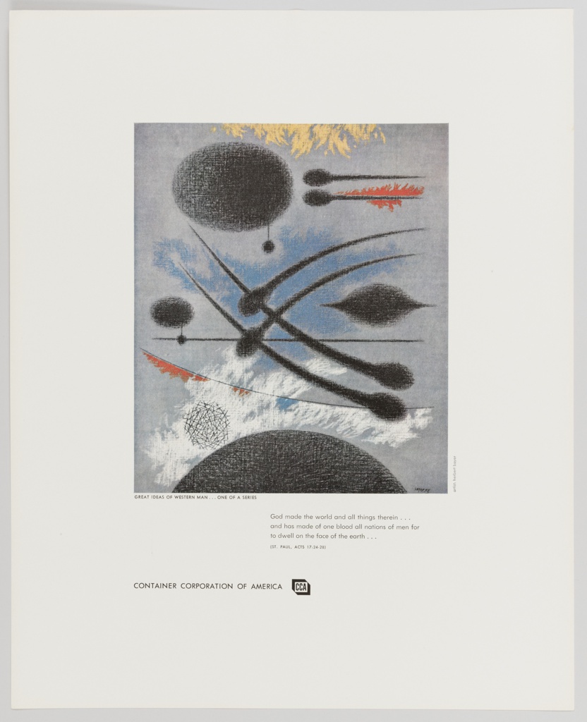 This is a Print. It was designed by Herbert Bayer and featuring artwork by Herbert Bayer and made for (as the client) Container Corporation of America. It is dated 1960 and we acquired it in 2016. Its medium is offset lithograph on glossy white paper. It is a part of the Drawings, Prints, and Graphic Design department.